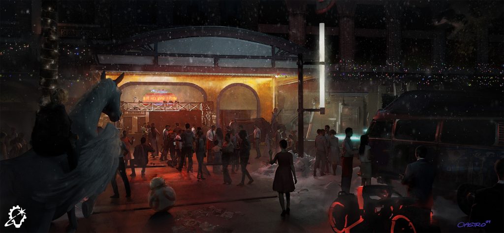 Turning to his time on A.I. Artificial Intelligence, Nakabayashi posits, “Those worlds – Coney Island, the Rouge City, an underwater theme park – were all absorbed through storyboards that Chris Baker did with Stanley Kubrick for a couple years. We started with that as our inspiration, and then we started doing colored artwork – paintings, drawings, some storyboards for shot ideas – and pitched those to [visual effects supervisor] Dennis Muren and numerous other people. It became this whole world of miniatures, and it was also on the brink of the digital component coming into the workflow. There’s a real marriage of practical effects, which I will still say is the most fun to work on, with the digital component.”