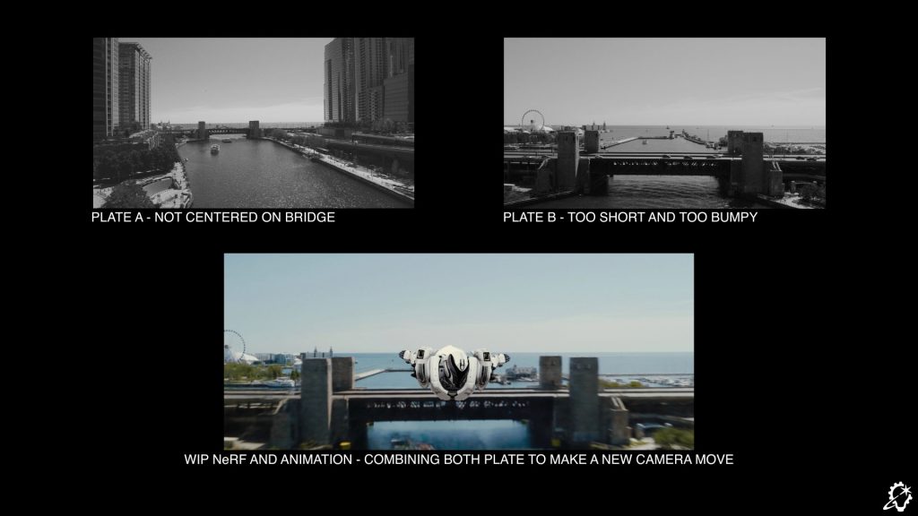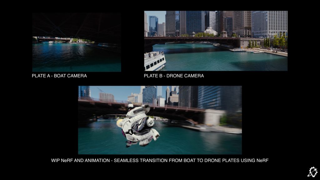 As the process evolved, ILM was able to apply these new capabilities in multiple ways. They could stitch a seamless transition between two separate camera views over the water, one captured by a drone and another from a boat, all without the need to create a new CG environment. Entire objects, such as street traffic on a bridge, could be removed. And because they were able to maintain parity between their visual effects environment and the Nerfstudio-rendered space, they could develop entirely new camera paths at the request of the filmmakers.