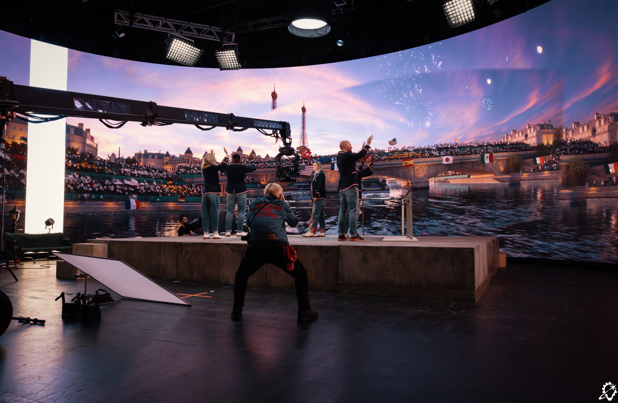 Not long before the shoot was set to begin. NBC arranged for director Steven Spielberg to film a special introduction for the Olympics on ILM’s volume set. The special moment required yet another new way of presenting a scene on the LED wall. Spielberg would walk on from the side, with the blank wall and its surroundings visible behind him, and then as he came to center stage, the Parisian riverside location would load.