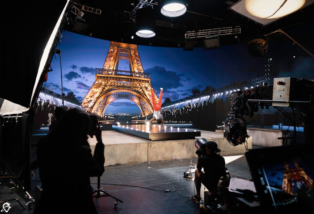 The volume itself can be adapted to any size, its “tiles” – LED panels – adjusted to the needed shape of a given set. Created by ILM’s virtual production team based in San Francisco, the entire infrastructure is built to move, “like a set-up for a rock concert,” as Milham puts it. For the Paris Olympics, a roughly 180-degree curved wall was constructed to a height of approximately 25 feet. This specific production involved the extensive use of foreground set pieces that needed to blend seamlessly with the virtual background, as did the elaborate practical lighting set-ups.