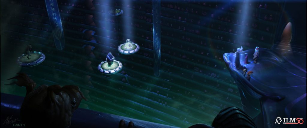 Gramstad: This concept was tackling two key problems for this scene. What should our balance be between Chris Sanders’s soriginal visual style and the limitations of live action expectations? At the same time, we could use this image to give practical design guidance for the environment team on how to stage the podium space so that the window both frames and provides value contrast to the Grand Councilwoman’s head for our primary focal point.