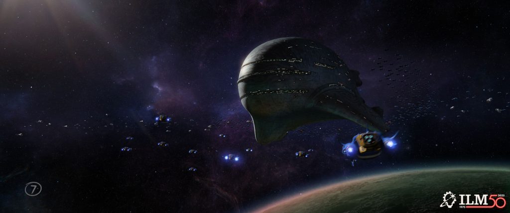 This shot was originally front lit against space and I thought it looked a bit flat. I reversed the lighting to make it back lit, which really helped the mother ship look more imposing. With the ship now pretty dark, adding a nebulous background really helped to make it pop and also added visual interest. Finally, adding a planet to the lower right justified adding some unusual light reflection to the dark side.