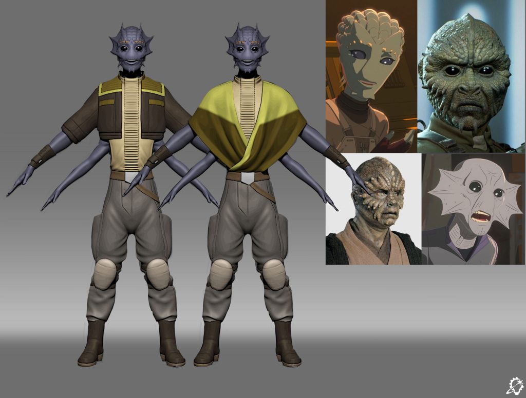 We considered multiple different species for Volo at first, lots of mulling over, lots of options that didn’t feel quite right. I proposed a Nikto, since they are such a varied species in the galaxy and have different subspecies and evolutionary traits depending on where they’re from. Maybe one subspecies evolved an extra pair of arms, which was a trait we needed. We landed there, but I don’t think we stayed there in the end, so I think Volo is something new altogether. I mostly took inspiration from previous Star Wars heroes! I wanted Volo to be very appealing, like you’d want to be their friend after you spend enough time following their story. I did a lot of additional drawings of Volo to find their mannerisms and expressions, the little things that make them, them