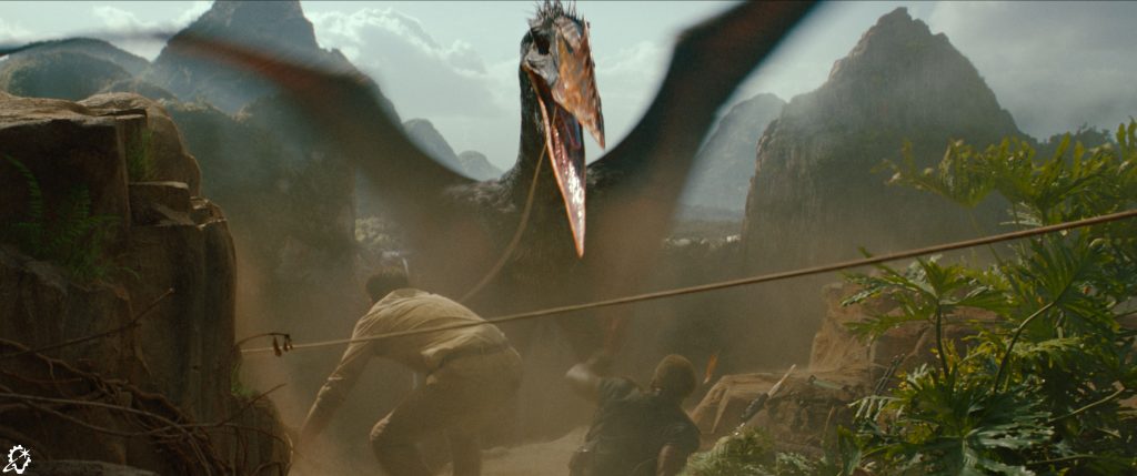 Different ILM supervisors took lead roles for each major sequence in the film. Chan’s team took on many of the water-heavy sequences featuring the Mosasaurus and the Spinosaurus, as well as the team that developed the Distortus Rex. Coco worked on the Mutadon sequences in the market and the tunnels as well as the T-rex chase sequence on the river, while Roberts tackled the beginning and ending of the film, as well as the cliff sequence featuring the Quetzalcoatlus.