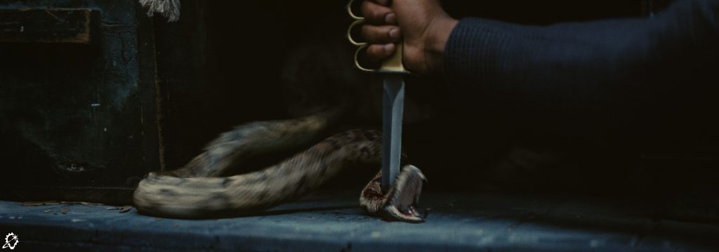ILM’s approach to the snake sequence needed to factor in the reality that Smoke would be interacting directly with the knife and the animal itself. Marshall relays, “For lighting purposes, we had to make sure that the knife was blocked accurately when Smoke brought it down over the top of the snake’s head. We did a basic digital double version of Smoke and reprojected some of the plate back onto that so – if you ever saw anything in a reflection – it had the correct texture of his hands and suit. We kept the knife as practical as we could but eventually took it over because the knife very visibly enters the snake’s head. We reconstructed the knife prop and used that for the reflections of our CG assets and blood interaction.”