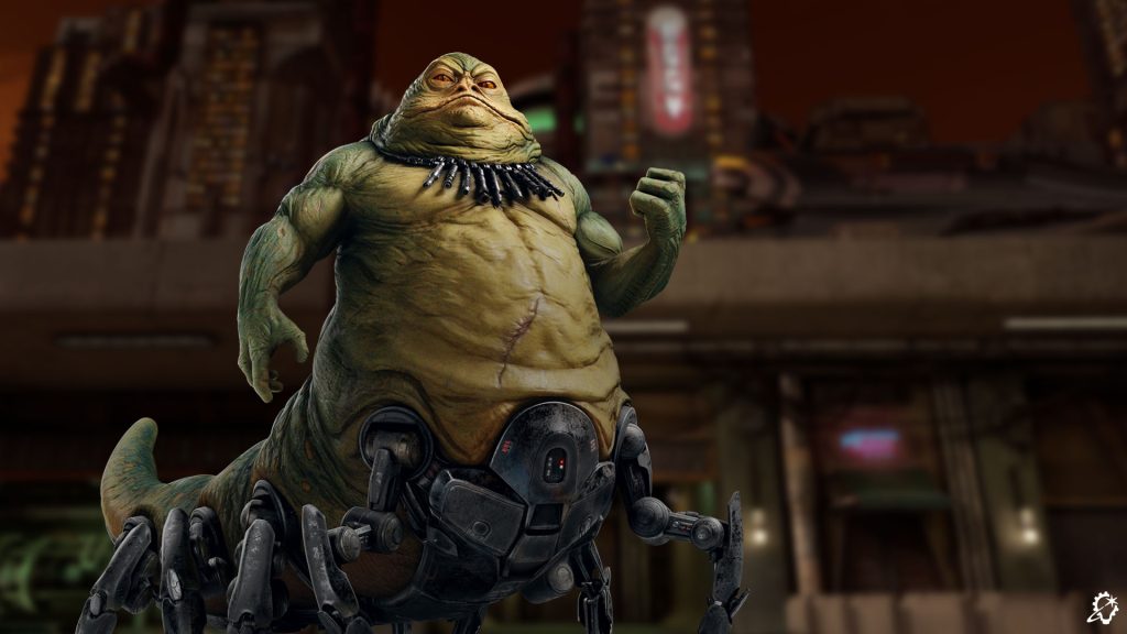 Grakkus the Hutt, a crime lord whose muscular frame sits perched atop cybernetic legs, made his debut in 2015’s Star Wars #9. An avid Star Wars fan, Moynihan was aware of the character prior to taking on the role in Beyond Victory, telling ILM.com, “I knew of the character from the comics. I knew he had robot spider legs. I knew he had a lightsaber necklace.” Once he discovered he’d be bringing Grakkus to life, Moynihan dove deeper into the lore surrounding the Hutt. “I bought the comics and read them,” Moynihan states before jovially reflecting on his early impressions of Grakkus by quipping, “I thought I was not nearly as jacked as I needed to be.”
