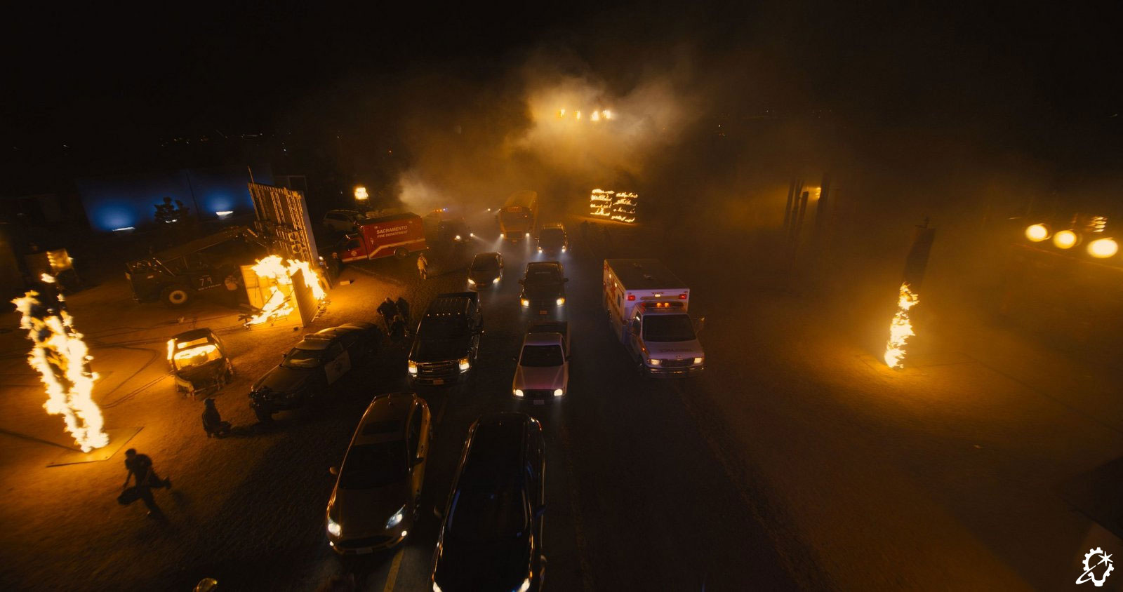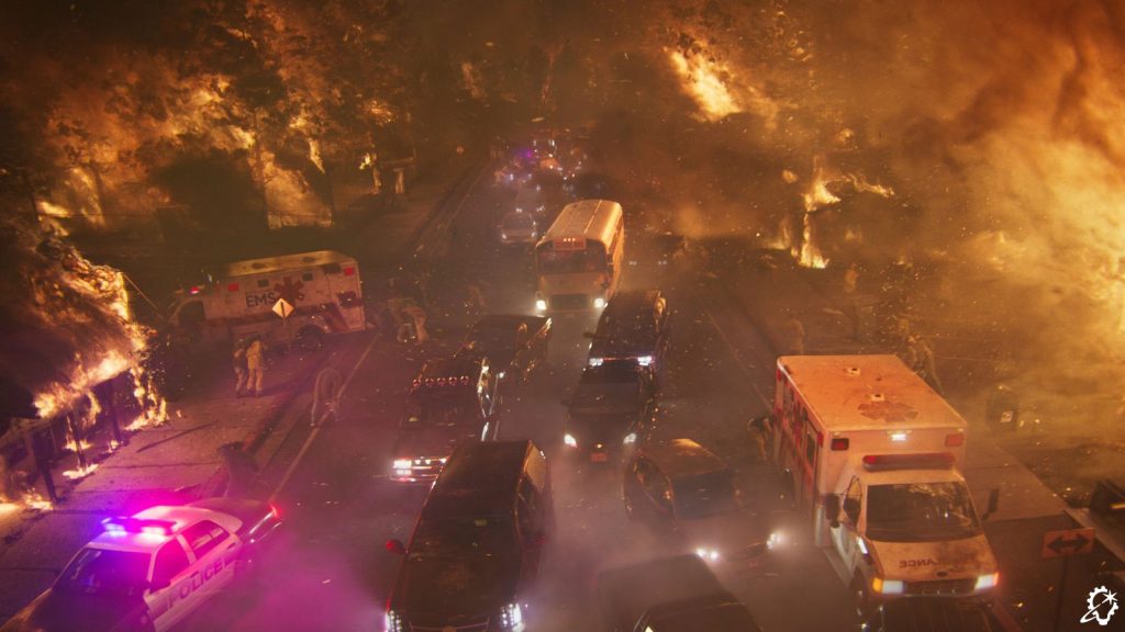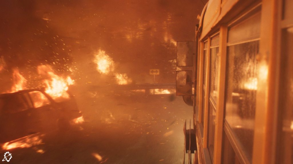 ILM broke up the reference megaclip into separate asset types. “We had shots within the smoke cloud, shots outside of the smoke cloud, big fires, small fires, brush fires, trees burning, houses burning, and cars burning,” Zaretti recalls. “There were fire tornadoes; I didn’t even know that was a thing! We were spoiled with references to the point where the references began to contradict each other because there’d be wind blowing in two different directions in the same piece of footage. Those contradictions actually helped us in certain scenarios. For example, during the escape sequence when the bus is winding down this thin road, there are points where we had flames licking at it from both directions to portray the danger that they were in. So, having a real reference to back up your visual effects often helps.”
