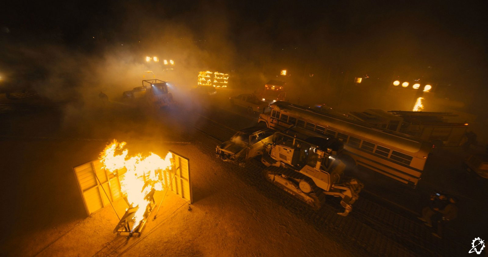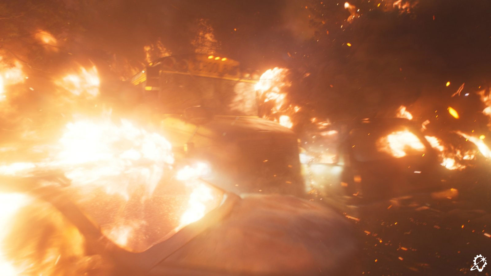 “That shot was an interesting one to put together, to transition from one environment to another, as we did end up needing to go all digital. The daytime section was the same environment we built previously, but because it’s bright out, we had to confirm all the details, like the tree simulations and so on, were there. We put in the CG bus windshield with the wipers, and we had a simulation for the embers. The bus was splatting into the embers, and due to the speed of the bus, the embers sort of floated to the side and got caught underneath the windscreen wiper. All of these details helped convey the sense of travel.”